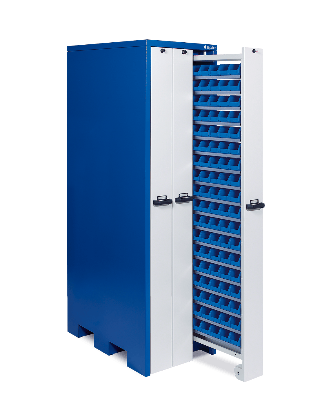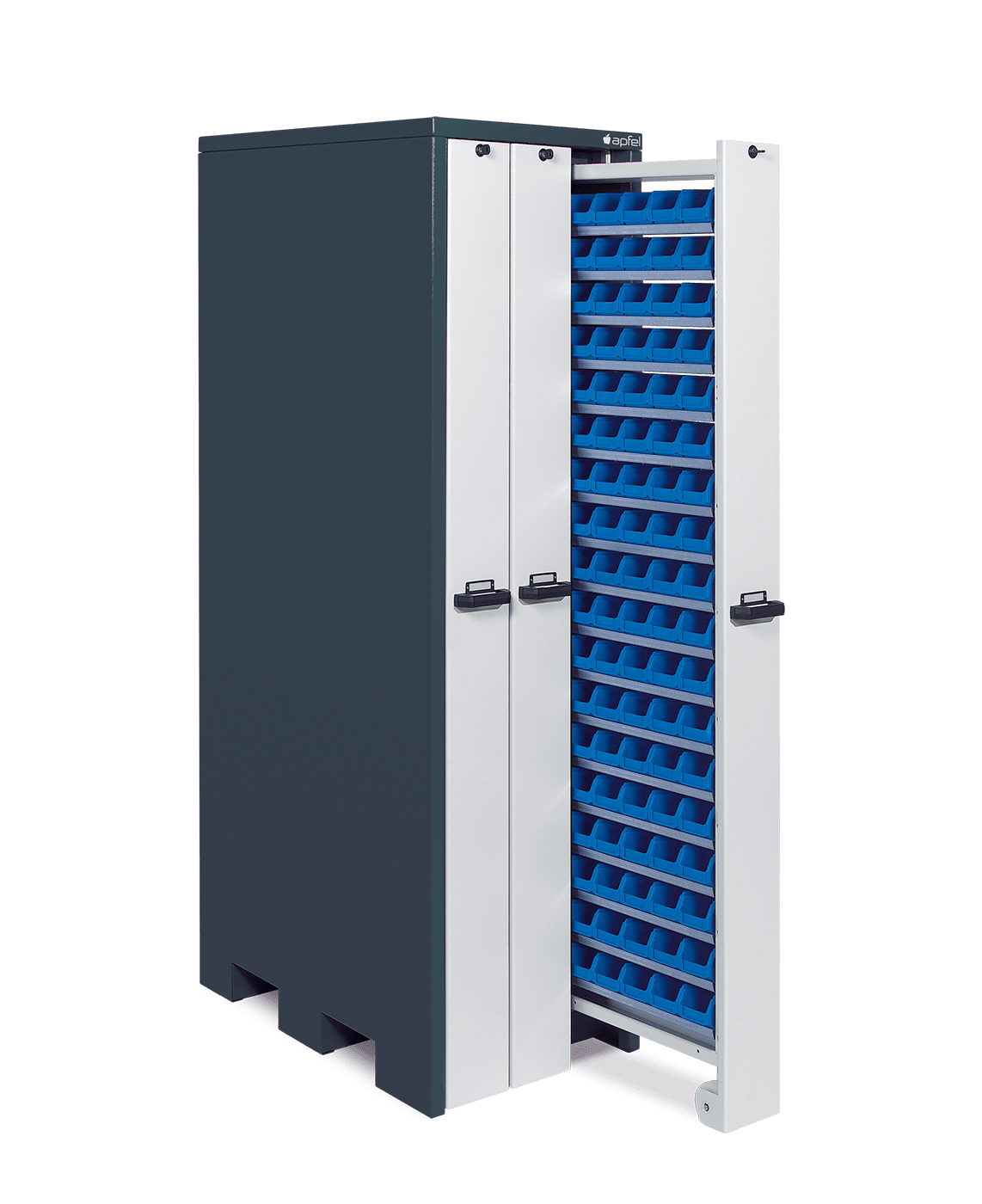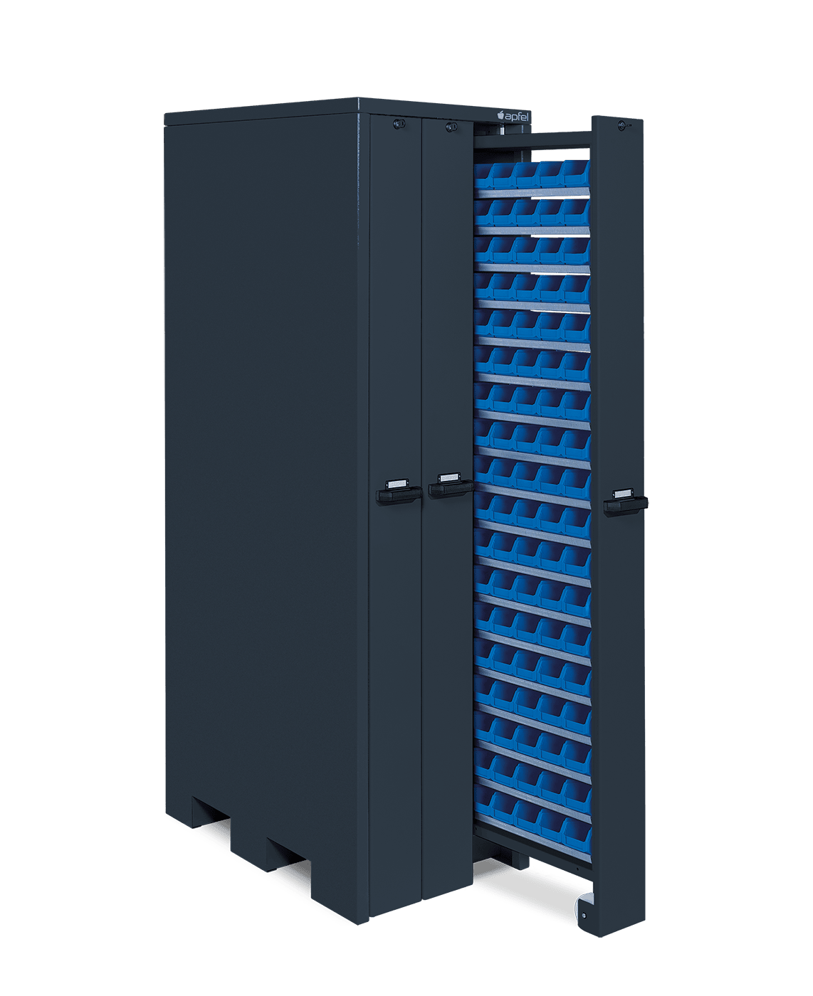 - Platzsparende Lagerung für viele verschiedene Artikel: Mit Maßen von 2.140 mm Höhe, 660 mm Breite und 1.050 mm Tiefe lagert der Schrank bis zu 432 Kästen strukturiert und griffbereit auf kleinster Fläche.