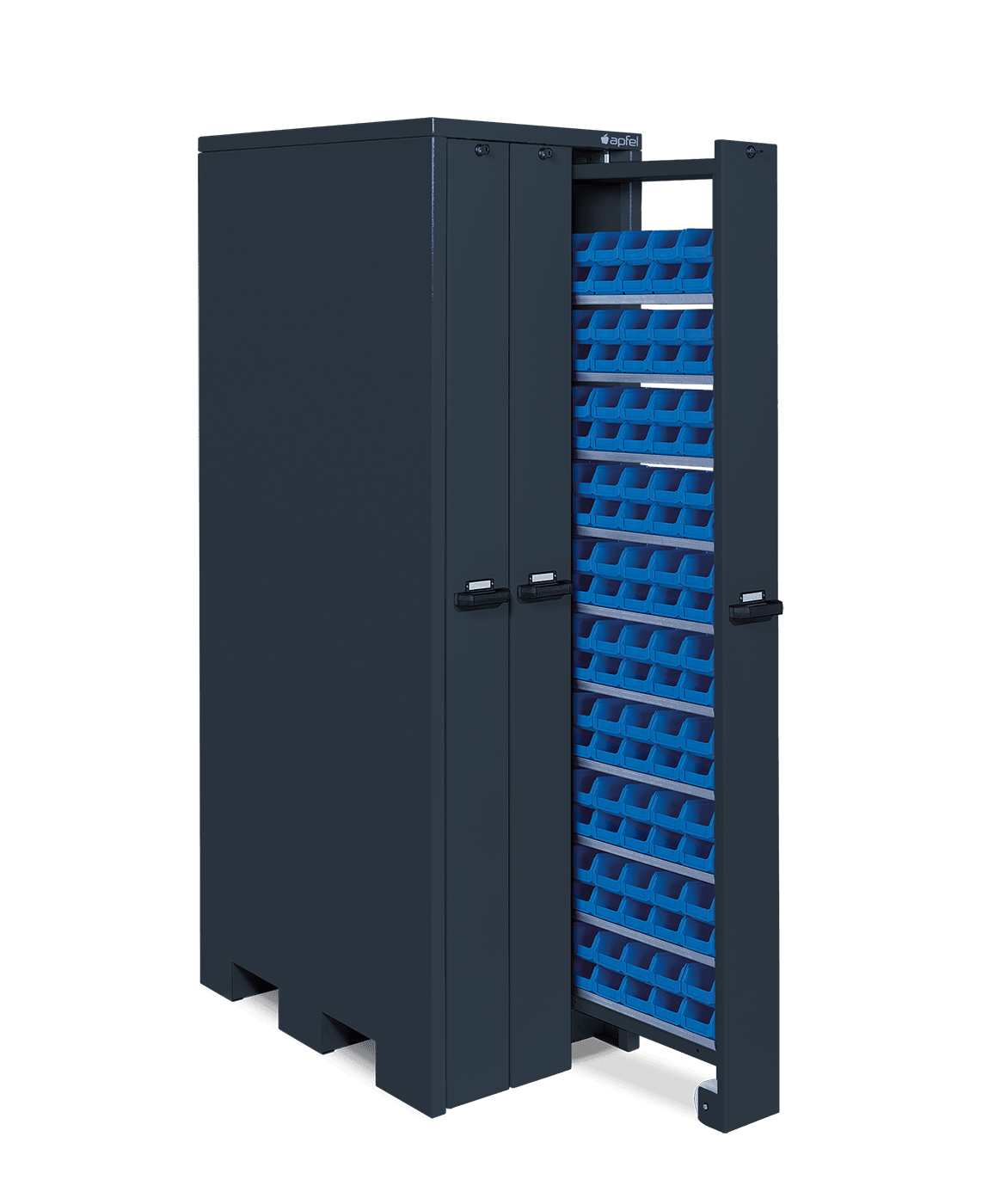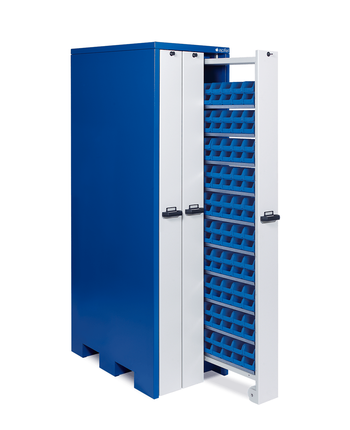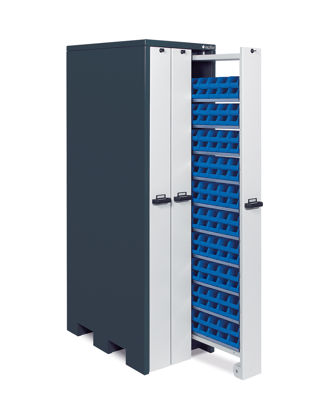- Platzsparende Kanban-Lagerung auf engstem Raum: Mit Maßen von 2.140 mm Höhe, 660 mm Breite und 1.050 mm Tiefe lagert der Schrank bis zu 240 verschiedene Artikel übersichtlich und griffbereit auf minimaler Stellfläche.