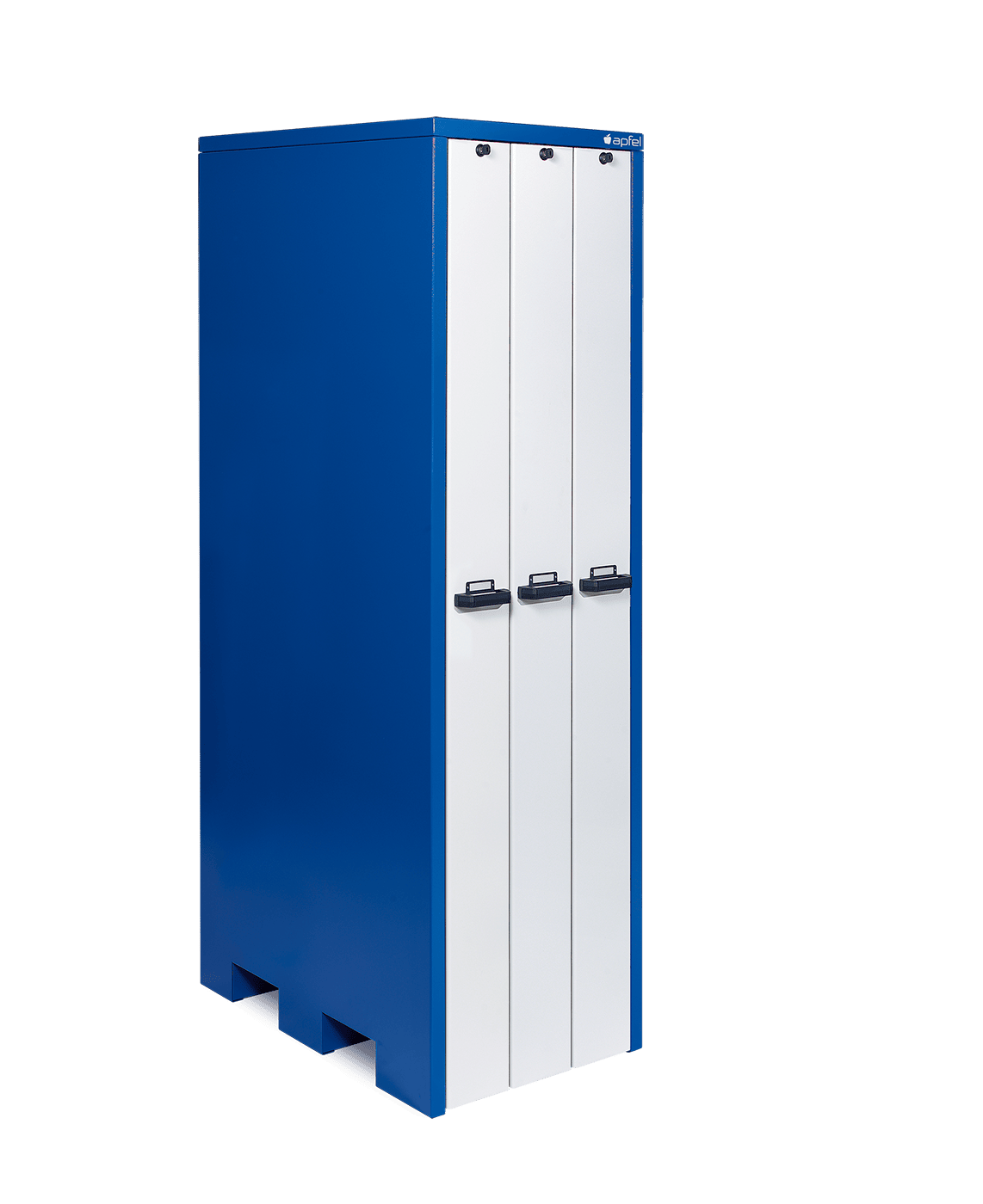 Der WKS 023 Set L plus eignet sich ideal für die strukturierte Kanban-Lagerung von bis zu 240 verschiedenen Artikeln bei minimalem Platzbedarf. Der Schrank verfügt über drei Vertikalauszüge à 180 mm Breite mit jeweils 900 kg Tragkraft. Im Lieferumfang sind 30 Lagerwannen WKH 701 und 480 Lagerkästen KLF 211 enthalten. Die pulverbeschichtete Stahlkonstruktion in Enzianblau (RAL 5010) und Grauweiß (RAL 9002) sorgt für Langlebigkeit und eine hochwertige Optik. Die Schrankmaße betragen 660 mm Breite, 2.140 mm Höhe und 1.050 mm Tiefe, das Leergewicht liegt bei 384 kg. Zur Ausstattung gehören mitlaufende Räder, Verfahrbarkeit per Hubwagen, einzeln abschließbare Auszüge und ein integrierter Komforteinzug.