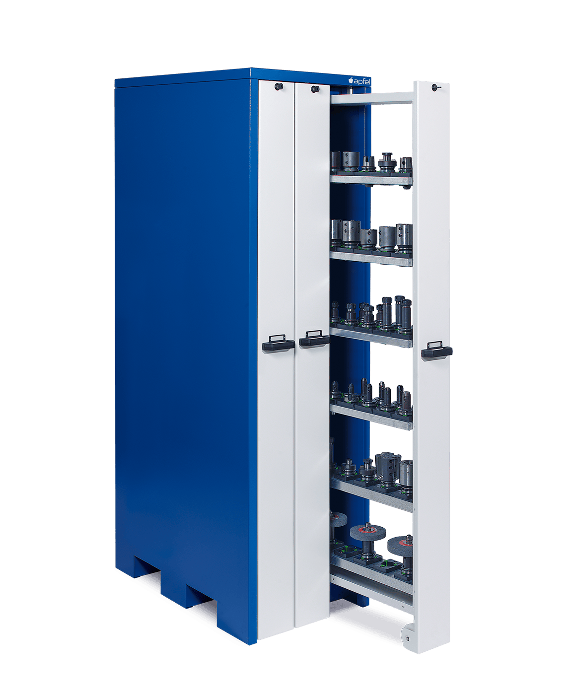 Der WKS 023 Set Z bietet die optimale Lösung für alle, die eine große Anzahl an Zerspanungswerkzeugen wie SK, HSK, VDI, ABS oder Capto sicher und übersichtlich auf engstem Raum lagern möchten. Mit 2.140 mm Höhe, 660 mm Breite und drei Vertikalauszügen à 900 kg Tragkraft ermöglicht der Schrank die strukturierte Aufbewahrung von bis zu 288 Werkzeugen. Achtzehn flexibel bestückbare Werkzeughalter WKH 403 oder WKH 404 sorgen für Ordnung und schnellen Zugriff im täglichen Betrieb.