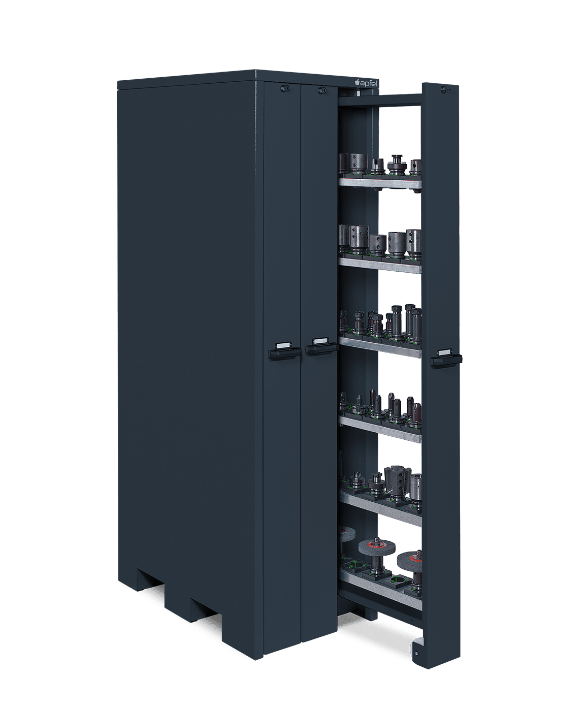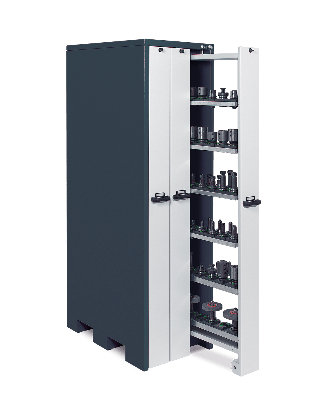 - Platzsparende Lagerung für verschiedene Werkzeugtypen: Mit Maßen von 2.140 mm Höhe, 660 mm Breite und 1.050 mm Tiefe bietet der Schrank die perfekte Lösung für bis zu 288 Werkzeuge – optimal für SK, HSK, VDI, ABS und Capto.