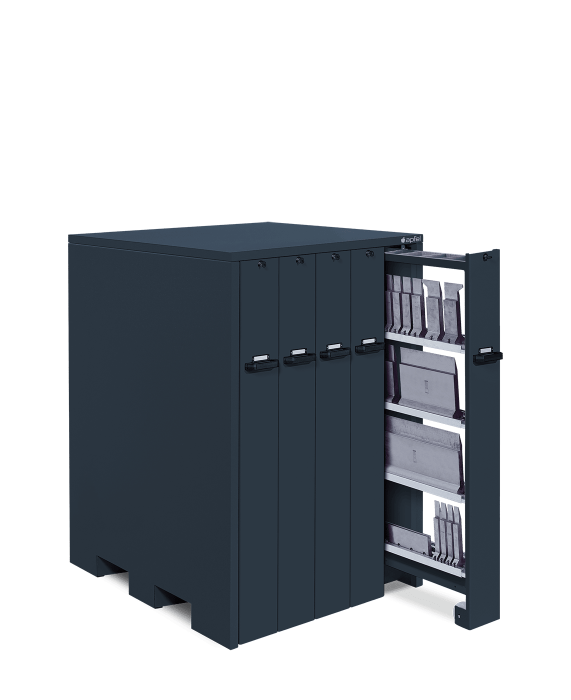 Der WKS 035 Set A bietet im praktischen Mittelformat viel Stauraum auf kompaktem Raum und sorgt für eine übersichtliche, ergonomische Lagerung von bis zu 44 laufenden Metern Abkantwerkzeugen. Mit 1.620 mm Höhe, 1.040 mm Breite und einer Tiefe von 1.300 mm eignet sich der Schrank ideal für den Einsatz in Werkstätten, in denen sowohl Kapazität als auch Ergonomie gefragt sind. Fünf Vertikalauszüge mit je 900 kg Tragkraft nehmen auch schwere Werkzeuge sicher auf. Das Zubehör mit zwanzig Werkzeughaltern und fünf Einlegeblechen sorgt für maximale Flexibilität bei der Organisation.