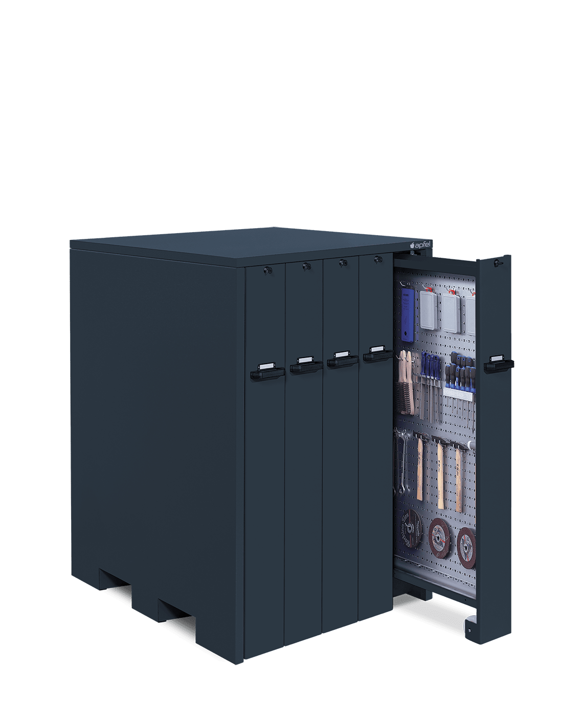 • Platzsparende Lagerung auf rund 12 m² Lochwandfläche: Mit Maßen von 1.620 mm Höhe, 1.040 mm Breite und 1.050 mm Tiefe lagert der Schrank zahlreiche Werkzeuge, Betriebsmittel und Verbrauchsmaterialien übersichtlich und griffbereit.