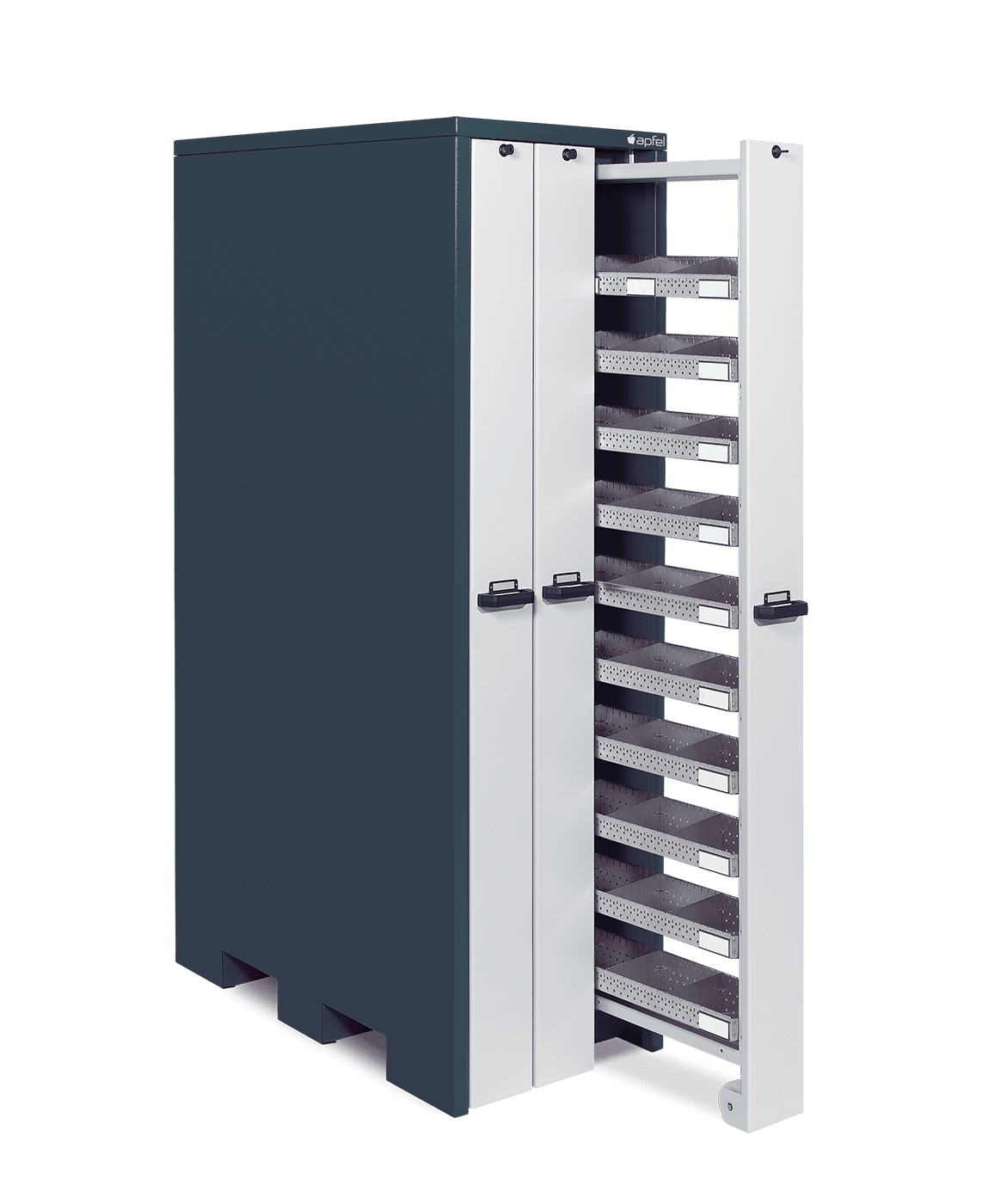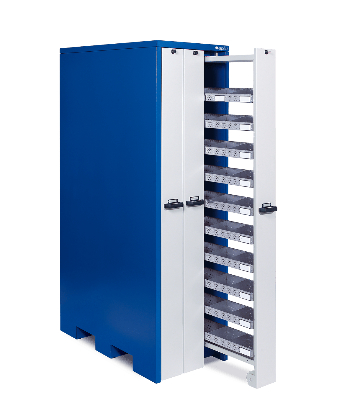 • Sicher und mobil: Jeder Auszug ist einzeln abschließbar und schützt wertvolle Bestände vor unbefugtem Zugriff. Mitlaufende Räder und die Verfahrbarkeit per Hubwagen ermöglichen einen einfachen Standortwechsel.