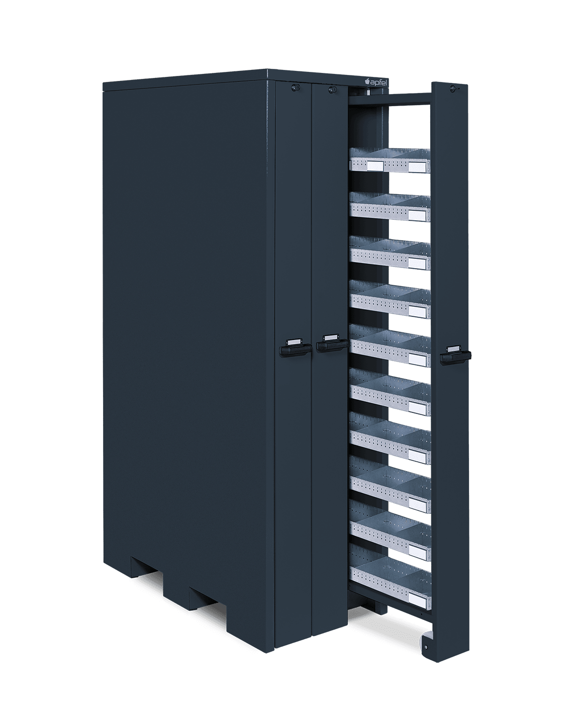 • Platzsparende Lagerung auf geringster Stellbreite: Mit Maßen von 2.140 mm Höhe, 660 mm Breite und 1.300 mm Tiefe lagert der Schrank große Mengen an Schrauben, Normteilen und C-Artikeln übersichtlich und griffbereit auf minimalem Raum.