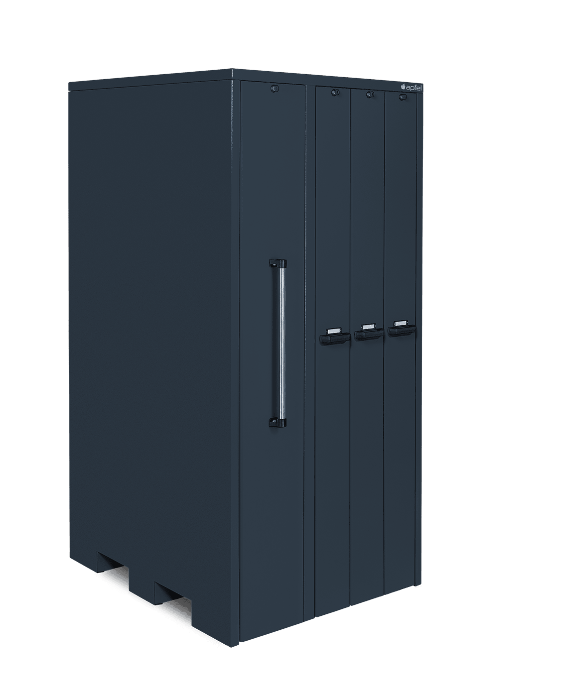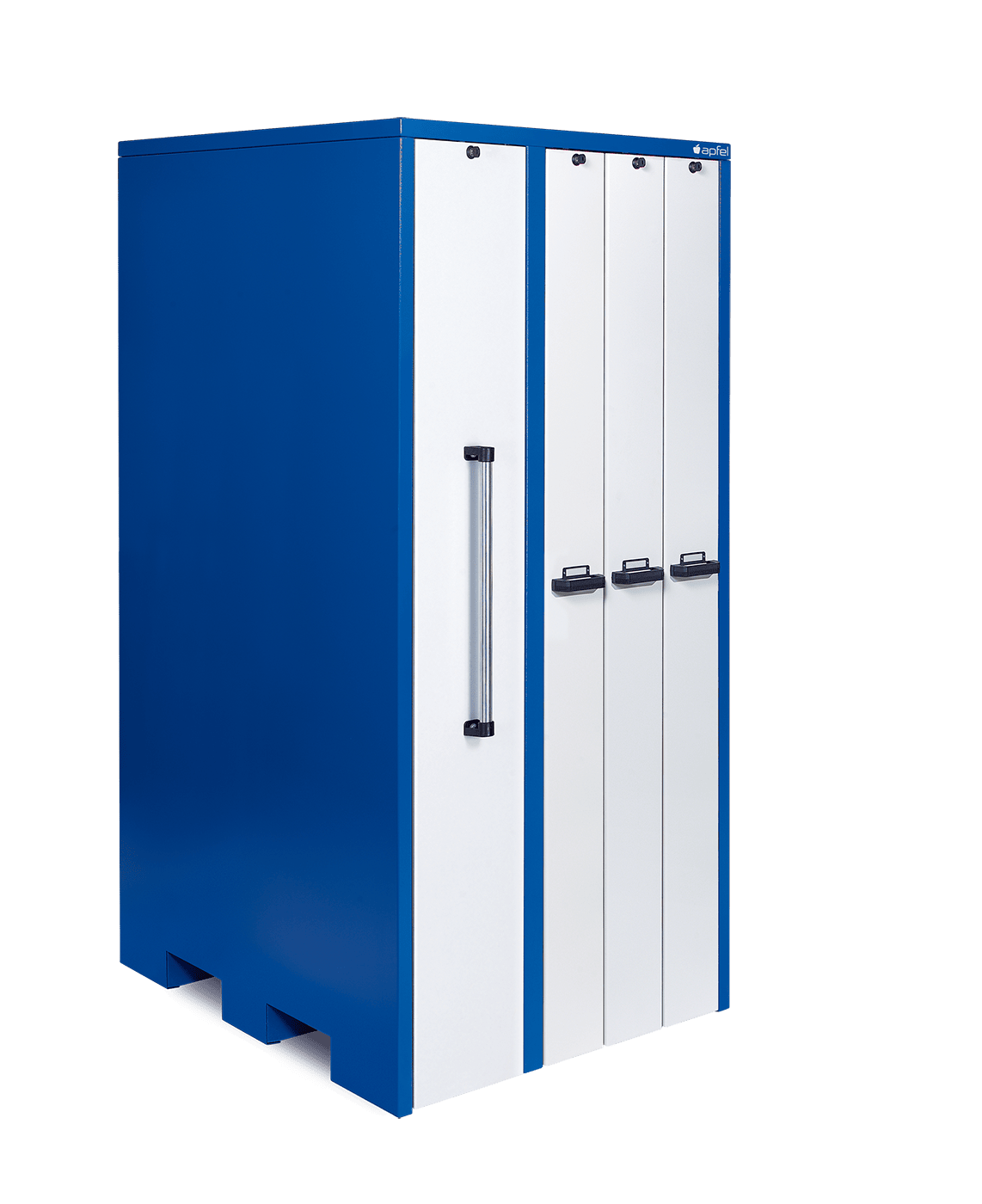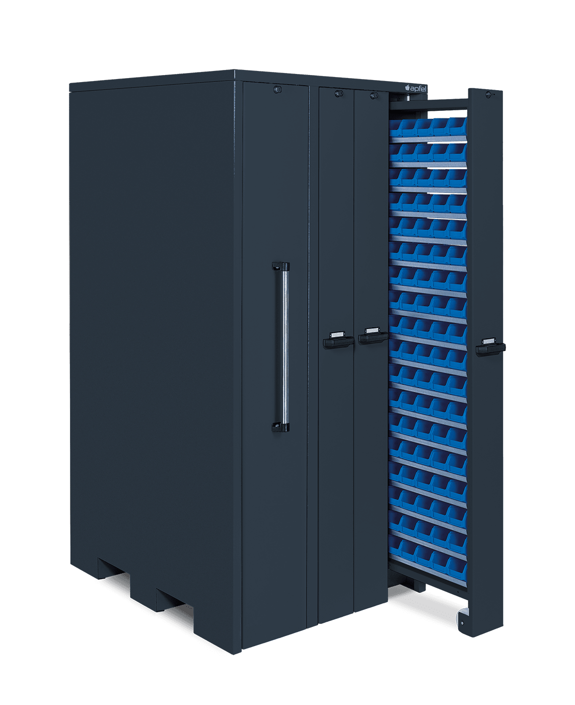 • Platzsparende Lagerung für viele verschiedene Artikel: Mit Maßen von 2.140 mm Höhe, 1.040 mm Breite und 1.300 mm Tiefe lagert der Schrank hunderte von Lagerkästen und große Lagerwannen übersichtlich und griffbereit auf minimaler Fläche.