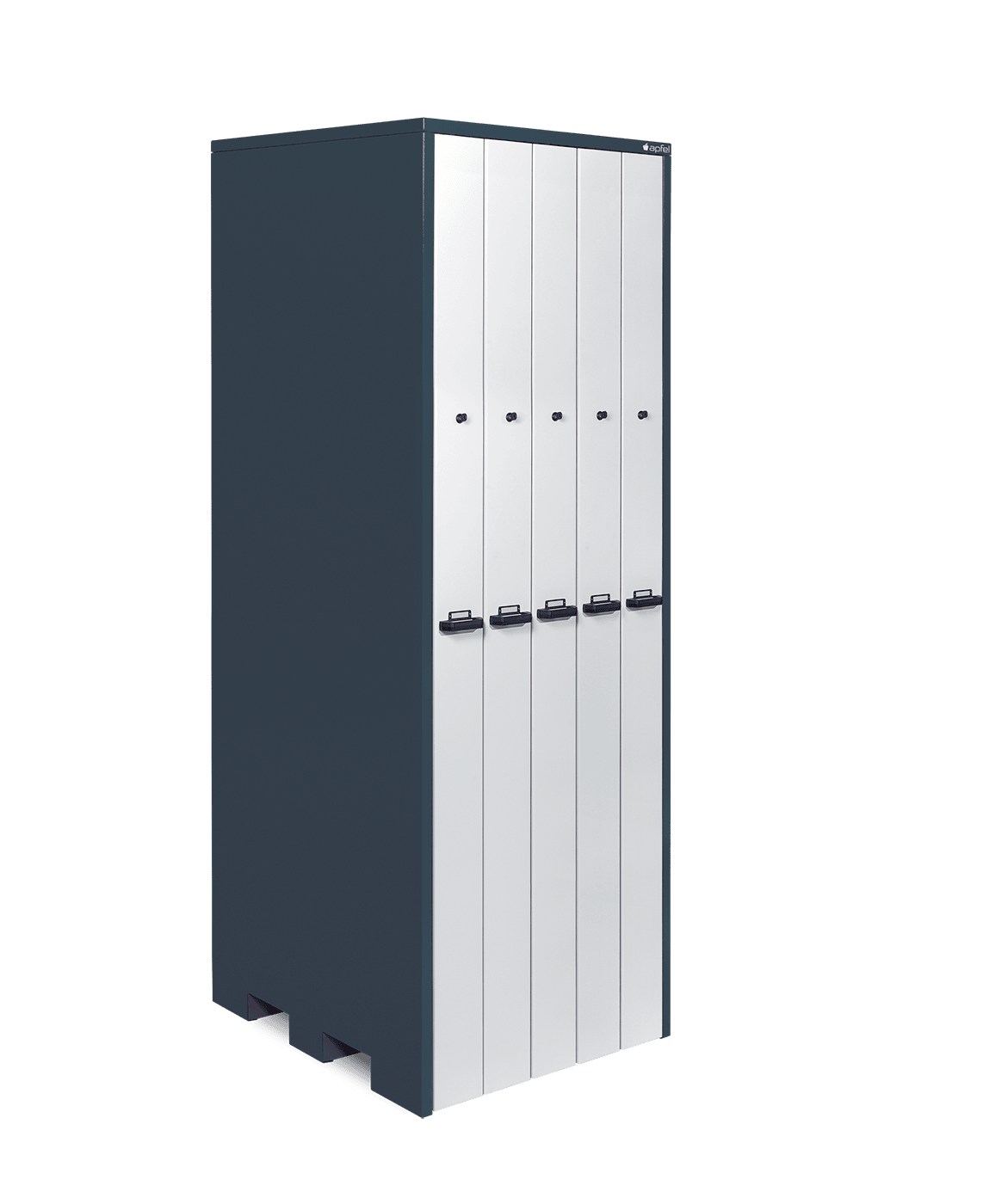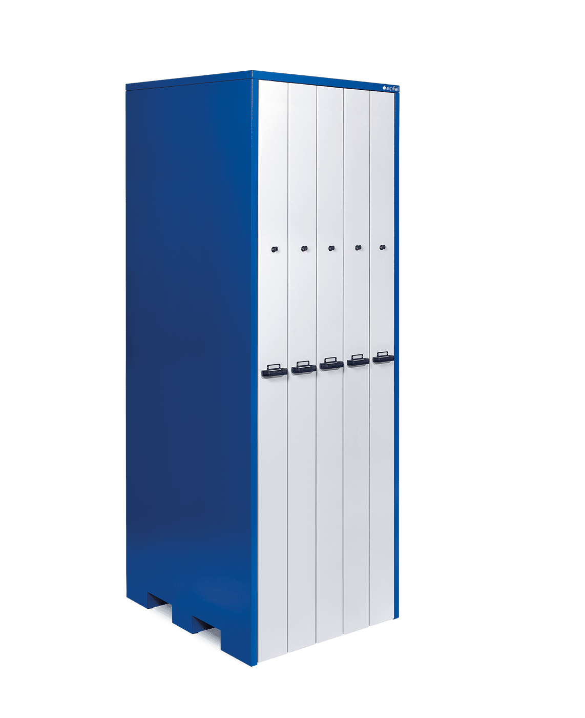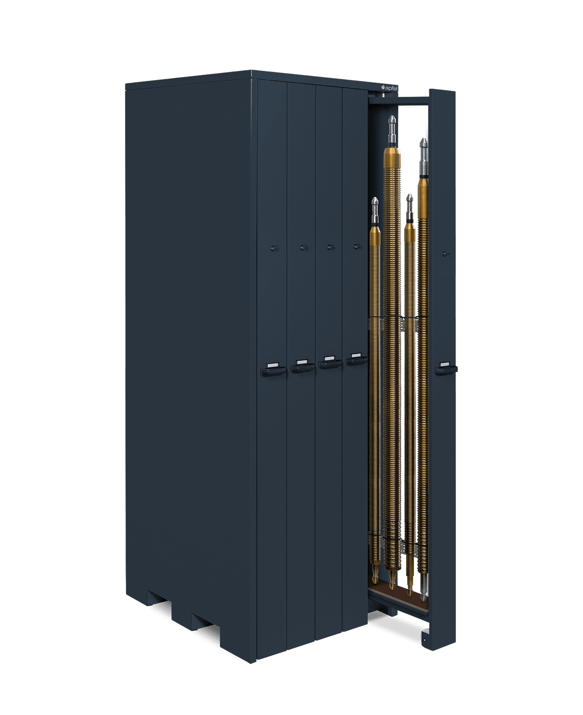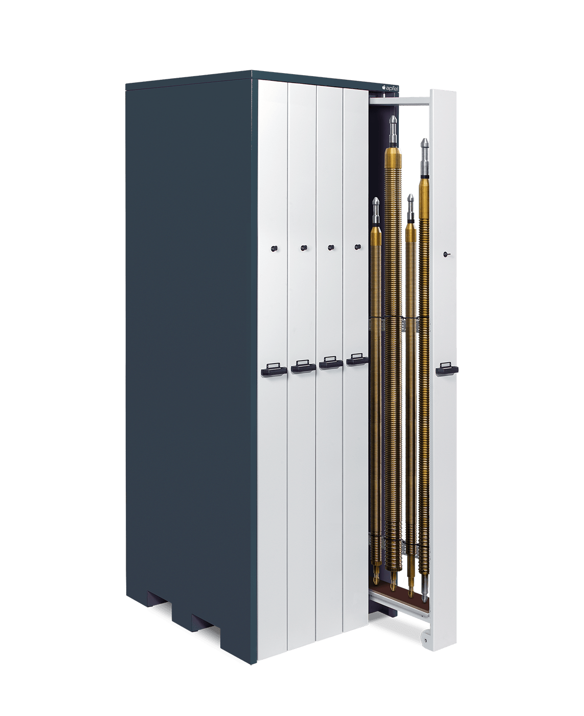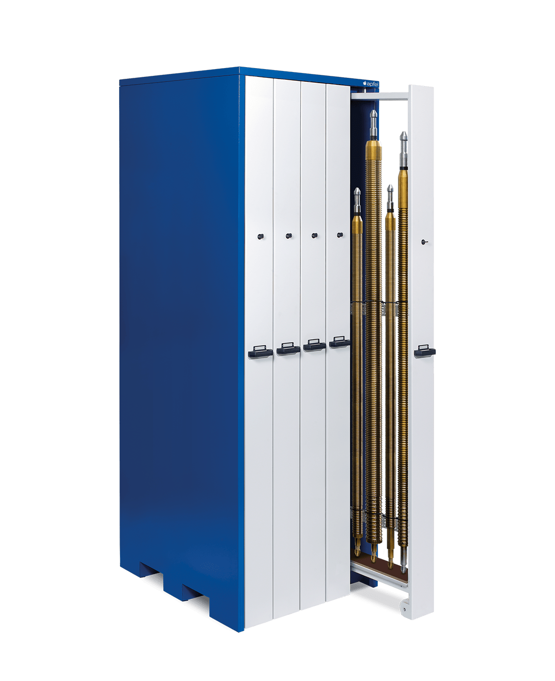 - Platzsparende Lagerung für besonders lange Räumnadeln: Mit Maßen von 2.850 mm Höhe, 1.040 mm Breite und 1.300 mm Tiefe eignet sich der Schrank optimal für die sichere Aufbewahrung von Räumnadeln bis 2.500 mm Länge.