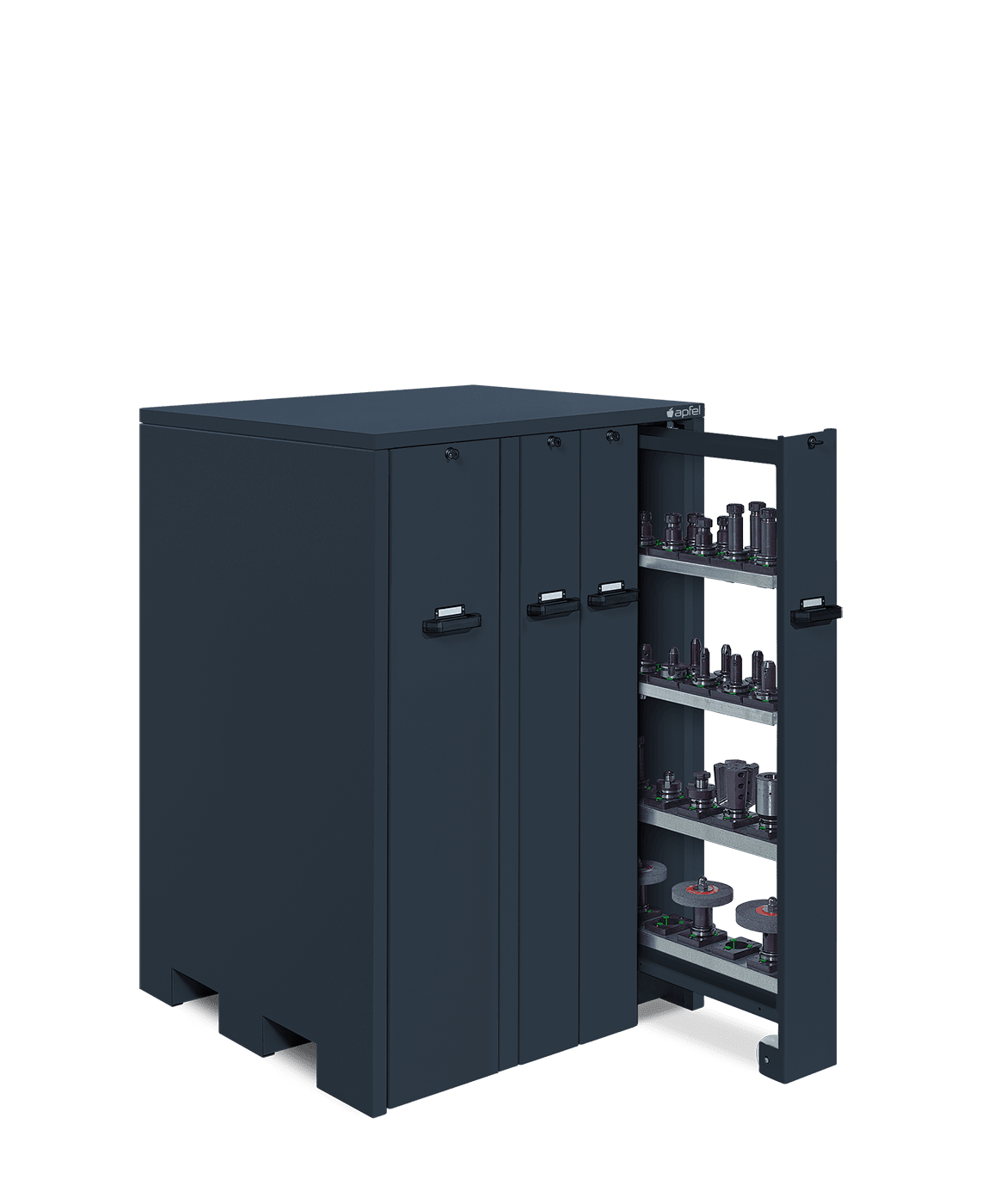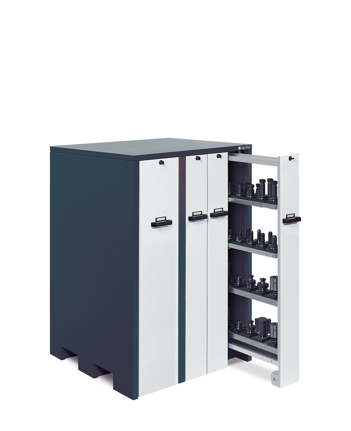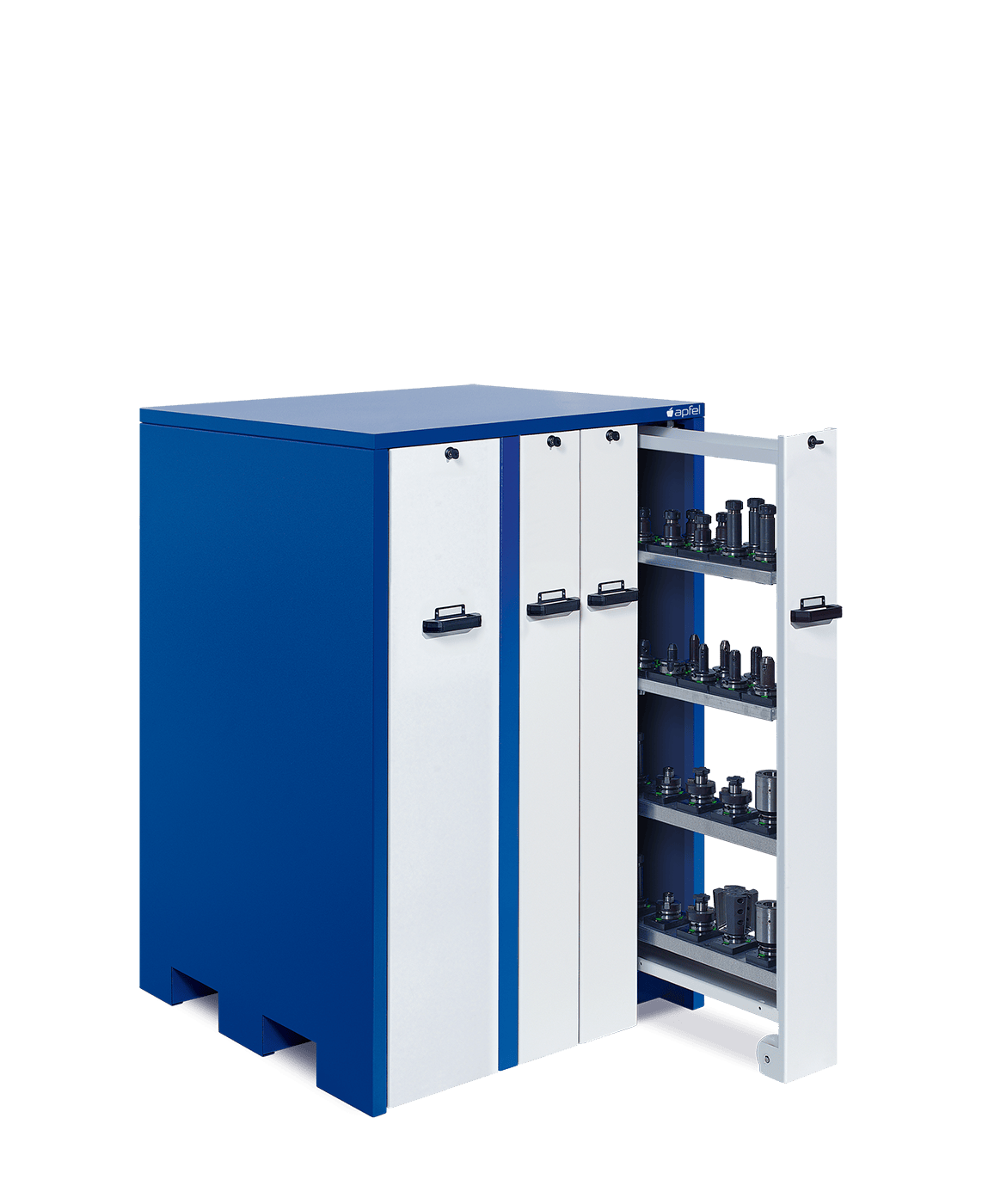 Der WKS 145 Set Z bietet auf 1.620 mm Höhe eine komfortable Arbeitshöhe für den schnellen und sicheren Zugriff auf bis zu 192 Zerspanungswerkzeuge wie SK, HSK, VDI, ABS oder Capto in Standardhaltern. Drei Vertikalauszüge mit je 900 kg Tragkraft und ein breiter Panzerauszug mit 1.800 kg Tragkraft ermöglichen zusätzlich die Aufnahme weiterer schwerer oder voluminöser Werkzeuge. Im Lieferumfang sind vier Werkzeughalter WKH 918 sowie zwölf Werkzeughalter WKH 403 oder WKH 404 nach Wahl enthalten. Das robuste Mittelformat vereint Ergonomie, Flexibilität und Sicherheit bei minimaler Stellfläche.