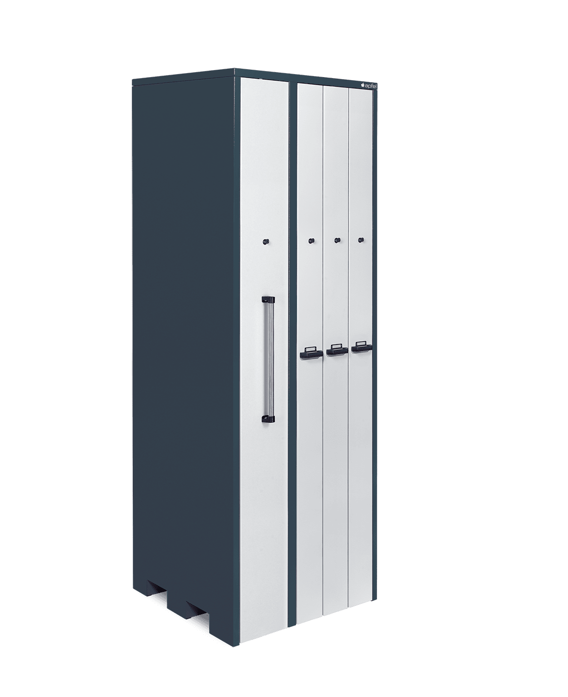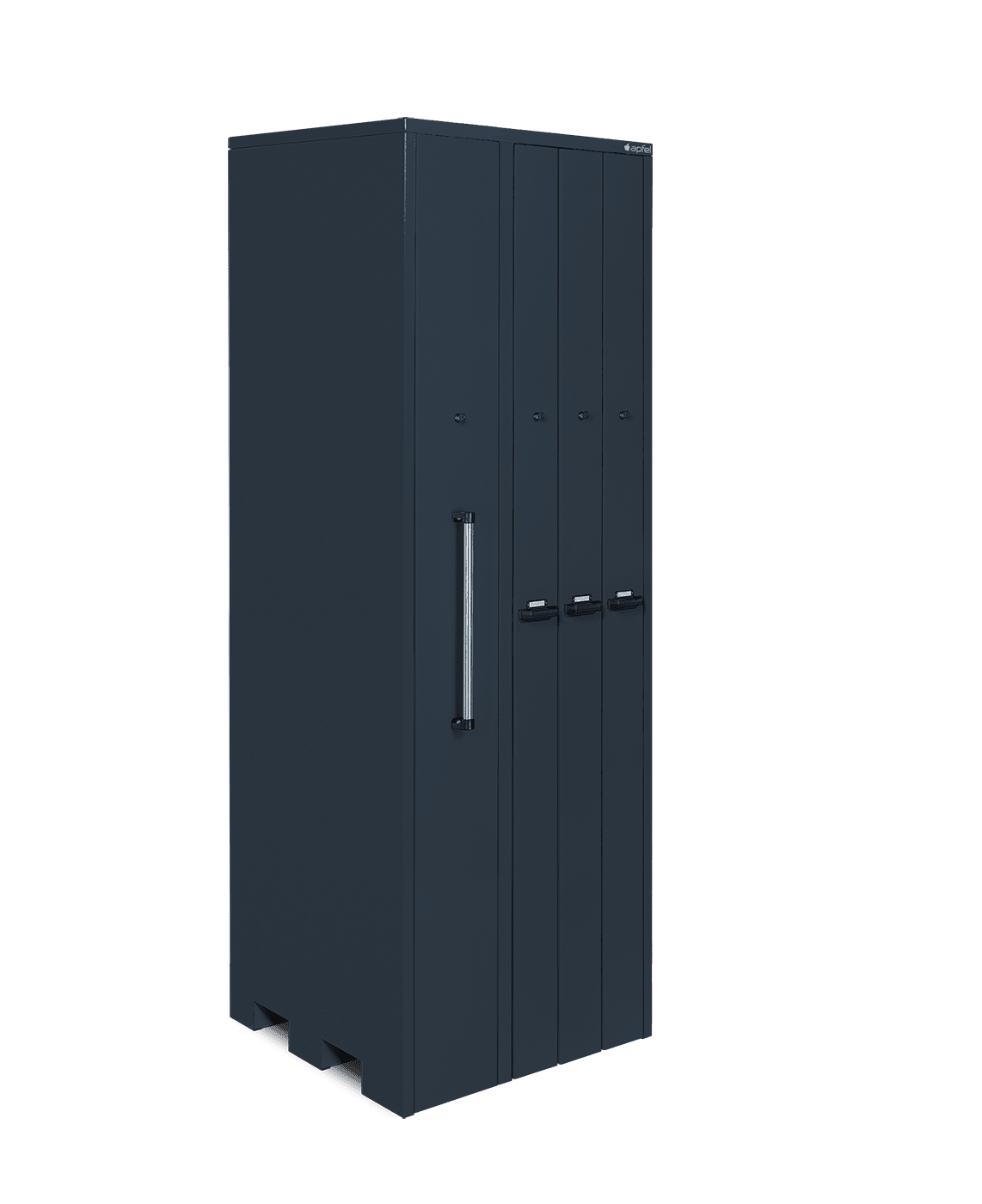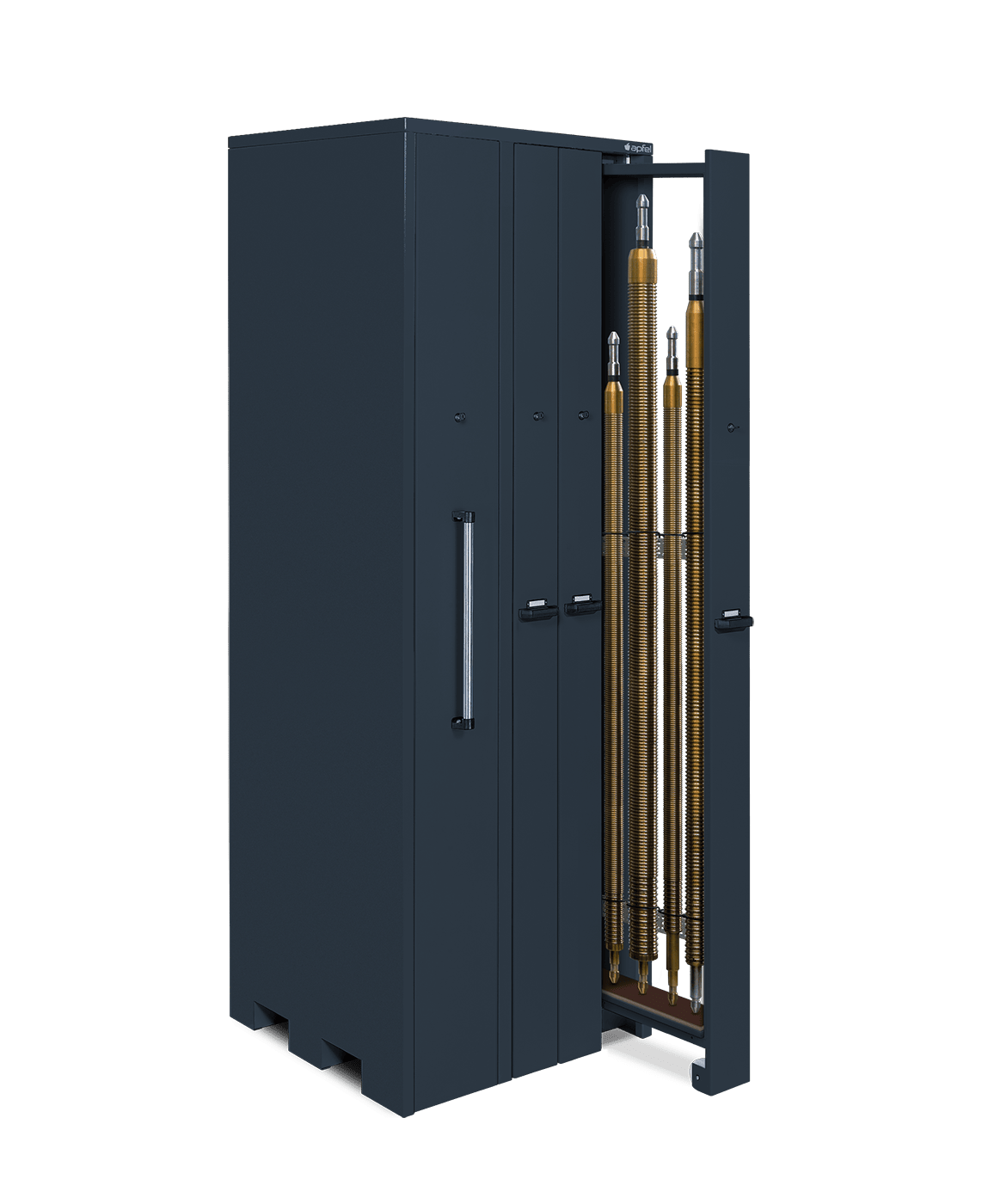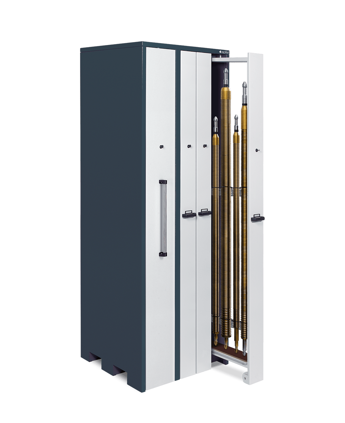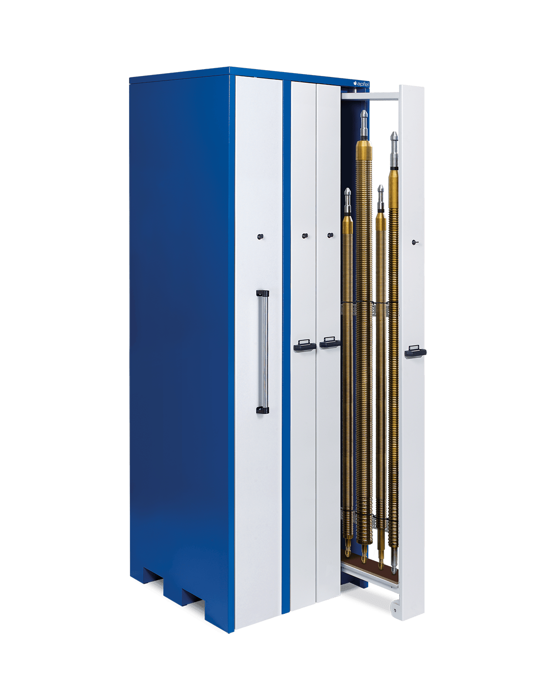 - Platzsparende Lagerung für besonders lange Räumnadeln: Mit Maßen von 2.850 mm Höhe, 1.040 mm Breite und 1.050 mm Tiefe bietet der Schrank optimale Bedingungen für die Lagerung von Räumnadeln bis 2.500 mm Länge.