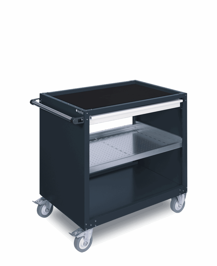 Standardmäßig sind die Werkstattwagen in Schwarzgrau RAL 7021 oder Enzianblau RAL 5010 erhältlich. Weitere RAL-Farben wie das Trumpf-Blau oder Ihre Firmenfarbesind auf Anfrage möglich, ideal zur Anpassung an bestehende Farbkonzepte in der Produktion.